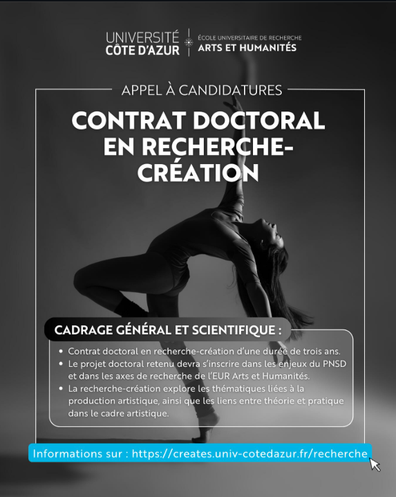 Le Pôle National Supérieur de Danse Rosella Hightower (PNSD) et l’École Universitaire de Recherche EUR Arts et Humanités (Université Côte d’Azur), lancent un appel à candidatures pour un contrat doctoral en recherche-création d’une durée de trois ans. Le PNSD, établissement d’excellence en formation artistique, est ouvert à la diversité des arts, encourageant les démarches innovantes qui croisent création artistique, transmission et production de nouveaux savoirs. L’EUR Arts et Humanités couvre la formation et la recherche des sciences humaines et sociales, mettant au cœur de sa recherche et de ses formations l’analyse des émergences et des transformations telles qu’elles se déploient dans les arts, la littérature et les langues, les cultures et les civilisations, la philosophie et l’épistémologie, les sciences de l’information et de la communication, la linguistique, l’histoire et