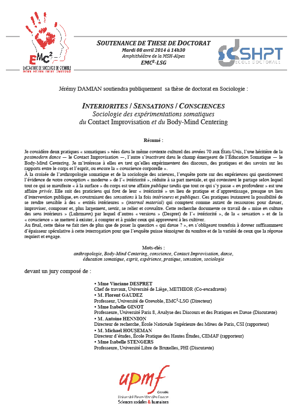 Soutenance de thèse de Jérémy Damian, Intériorité / Sensations / Consciences. Sociologie des expérimentations somatiques du Contact-Improvisation et du Body-Mind Centering.